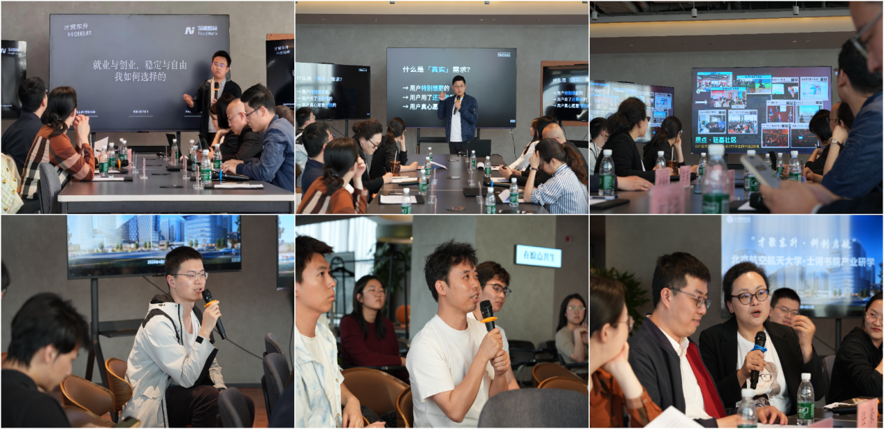 北京中科深维智能科技有限公司CEO郝光福、Vibe Friends组织者/前稀土掘金联合创始人江昪两位园区优秀企业代表受邀分享创业历程、技术方向与园区发展体验,结合实战经验为学子答疑解惑。互动环节中,同学们围绕团队搭建、项目起步、政策申报、资源对接等问题踊跃提问,现场交流氛围热烈。